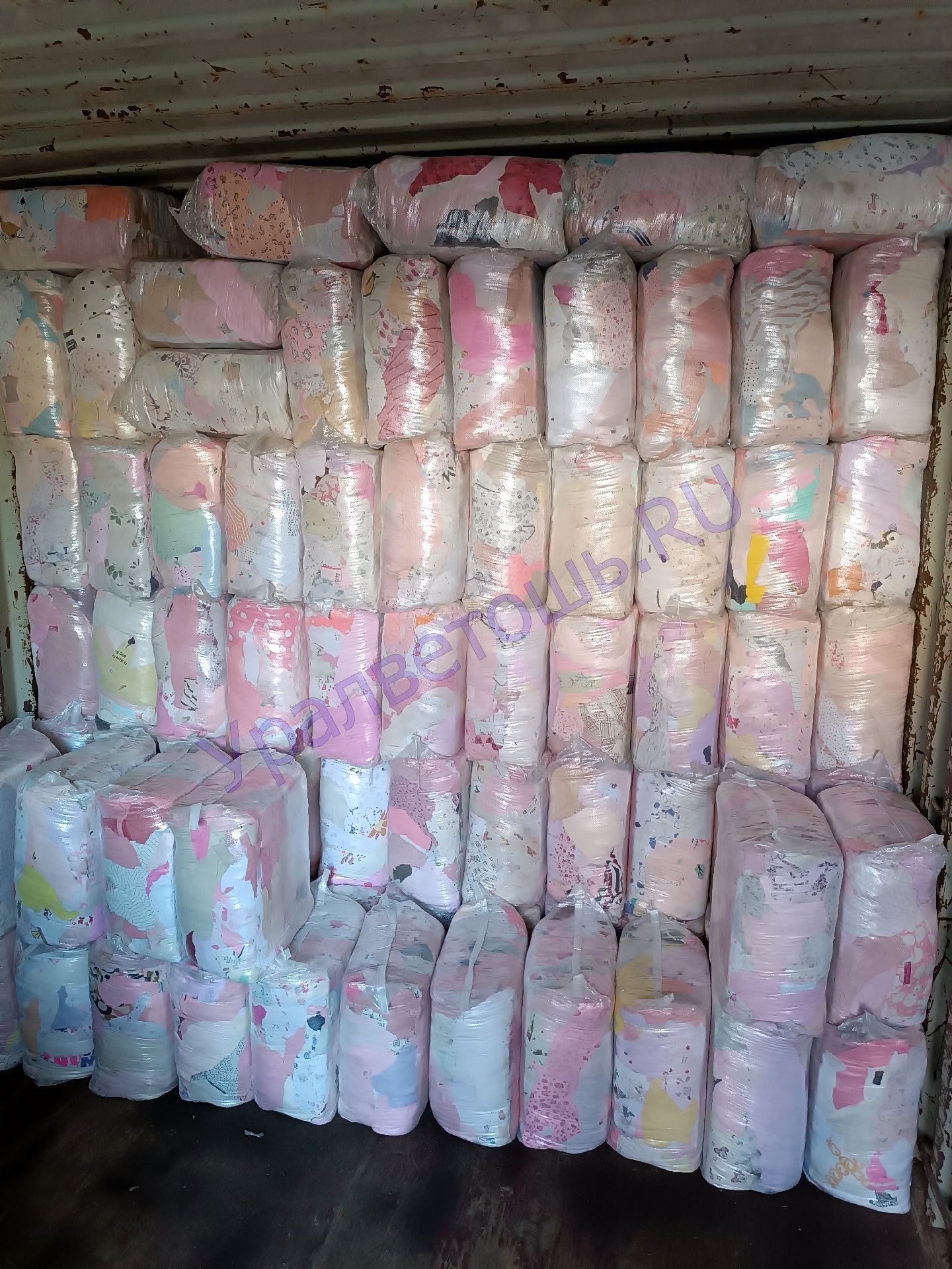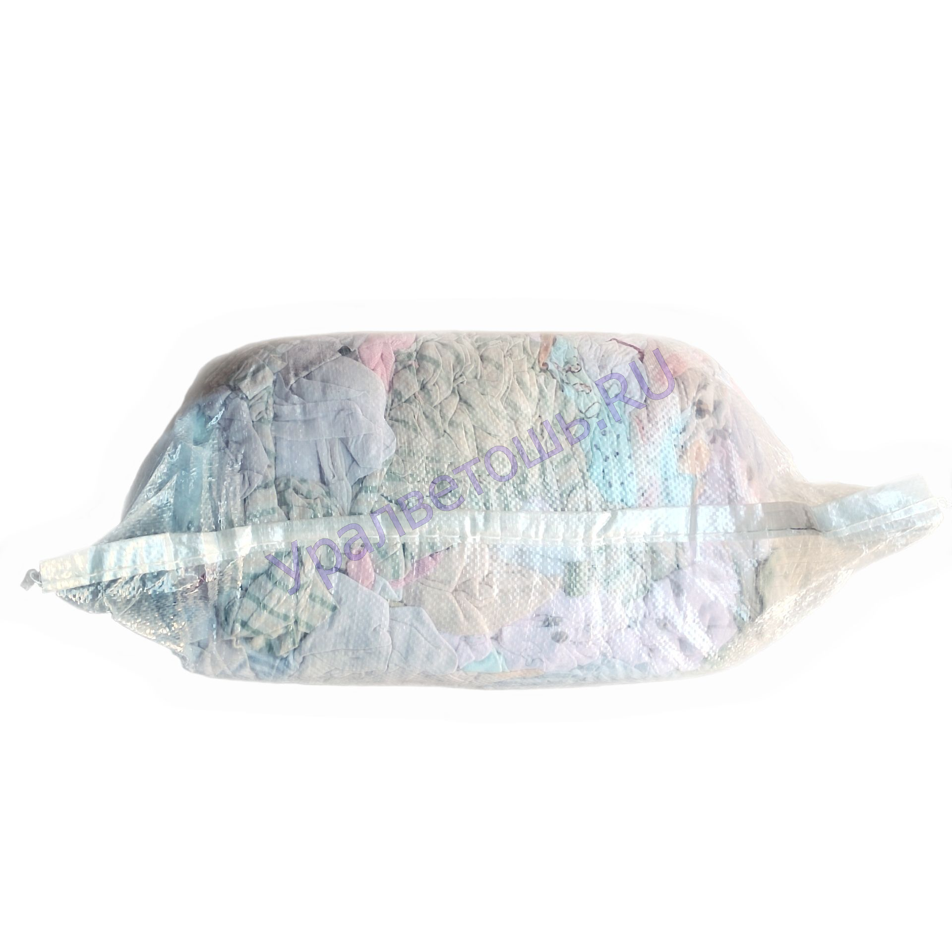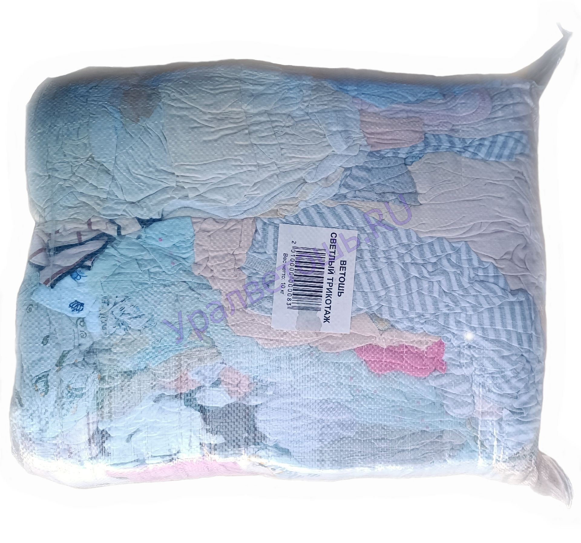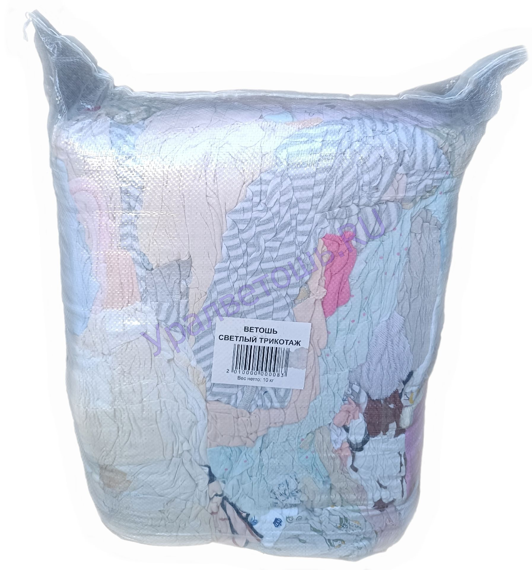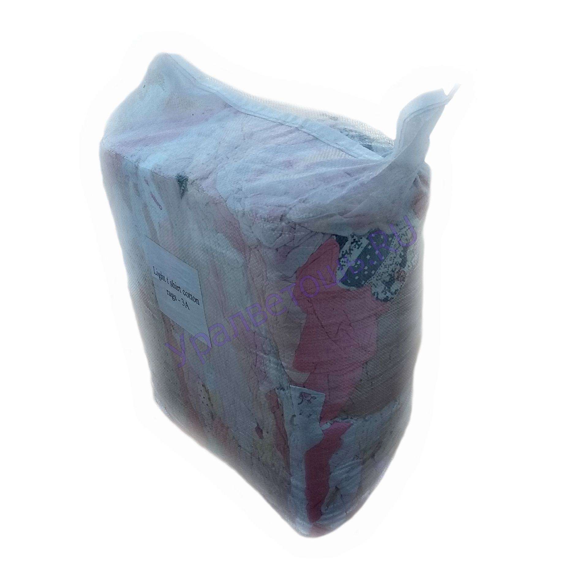 ХБ-100%. Смешанный по цвету трикотажный лоскут светлых и белых тонов. Крупный лоскут (майки, футболки). Высший сорт. Брикет- 10 кг. Упаковка- полиэтиленовая пленка.
